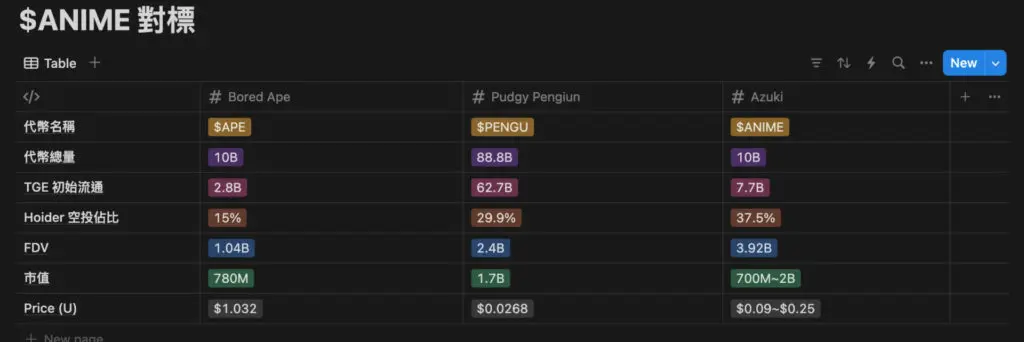 目前$ANIME 在Aevo 上线的盘前交易价格为$0.072,笔者试以同为乙太蓝筹NFT 社群的PudgyPenguins $PENGU 及Bored Ape $APE 对标。