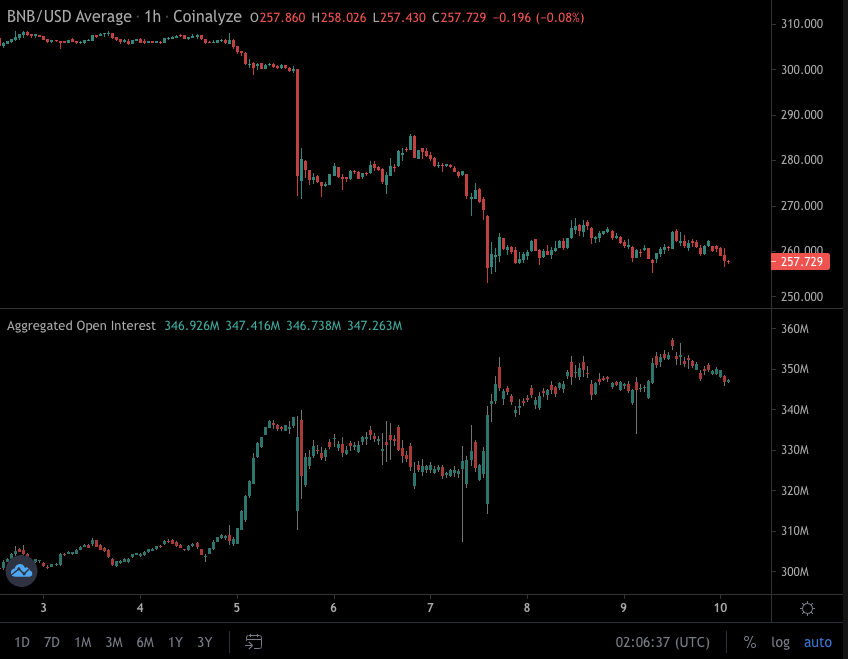随后,根据Coinalyze的数据,BNB的未平仓合约量(即投资者持有的未平仓永续合约数量)接着在6月5日事发前9个小时陆陆续续增加了近3000万美元。