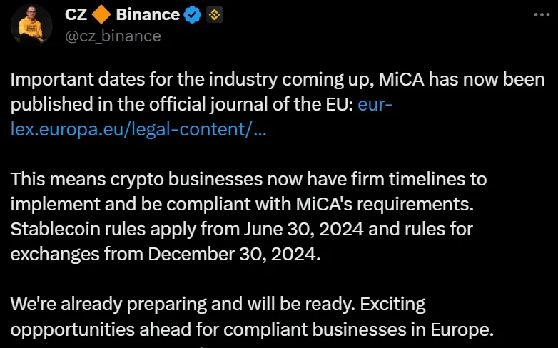 CZ对MiCA法案通过给予了正面的支持,并称币安已经在着手准备相关内容
