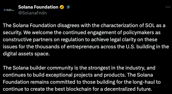 另一方面,Solana基金会11日也发布声明重申,Solana基金会不同意SEC将SOL定为证券。声明提到:我们欢迎政策制定者的持续参与,为美国各地成千上万的企业家在数字资产领域的构建提供法律明确性。Solana拥有加密行业内最强大的开发者社群,将会继续构建优质项目和产品。Solana基金会仍然致力于长期建设,继续为去中心化的未来创造最好的区块链。