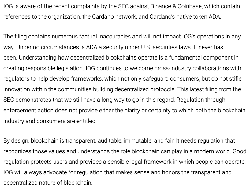上述三个代币中市值最大的公链代币ADA,其开发商IOG早在7日就做出回复,表示在任何情况下ADA都不应被SEC归类为证券。公告写道:该申诉文件中存在许多事实错误,并且不会对IOG的营运产生任何影响。在任何情况下ADA都不应被SEC归类为证券,了解去中心化区块链的运作方式是制定负责任立法的基本组成部分,IOG将继续欢迎与监管机构进行跨行业合作,以帮助制定既能保护消费者,又不抑制建立去中心化协议社群创新的框架。SEC最新的申诉文件表明,在这方面我们还有很长的路要走。通过执法行动进行规范并不能提供区块链行业和消费者应有的明确性或确定性。