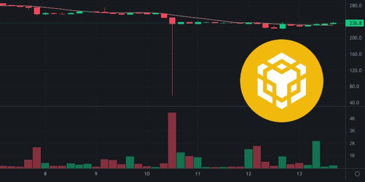 MATIC曾一度重挫19%,SOL下跌17%,ADA下跌16%;而BNB先是下跌10%后,现货交易对「BNB/USDC」在下午3:45分左右突插针暴跌76%,从每枚BNB价格为236美元下跌至57美元,随后又急速拉回235美元的价格水平,而单周bnb暴跌幅度也达16.3%。