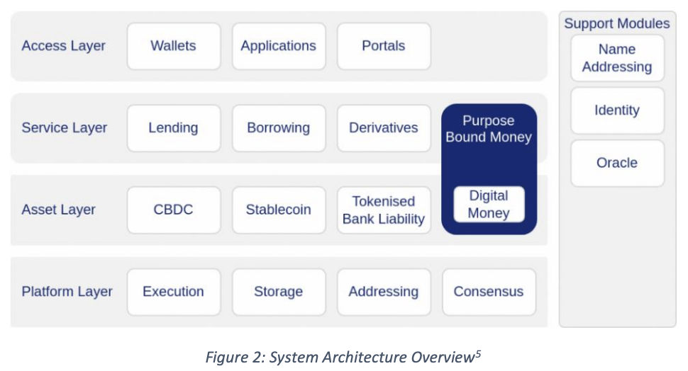 在描述PBM协议时,引用了一个四层模型来为其定位,数字货币网络的组件可以分为四个不同的层次:接入层、服务层、资产层和平台层,PBM可以被描述为一种服务,当数位货币作为PBM绑定时,它横跨了服务层和资产层。