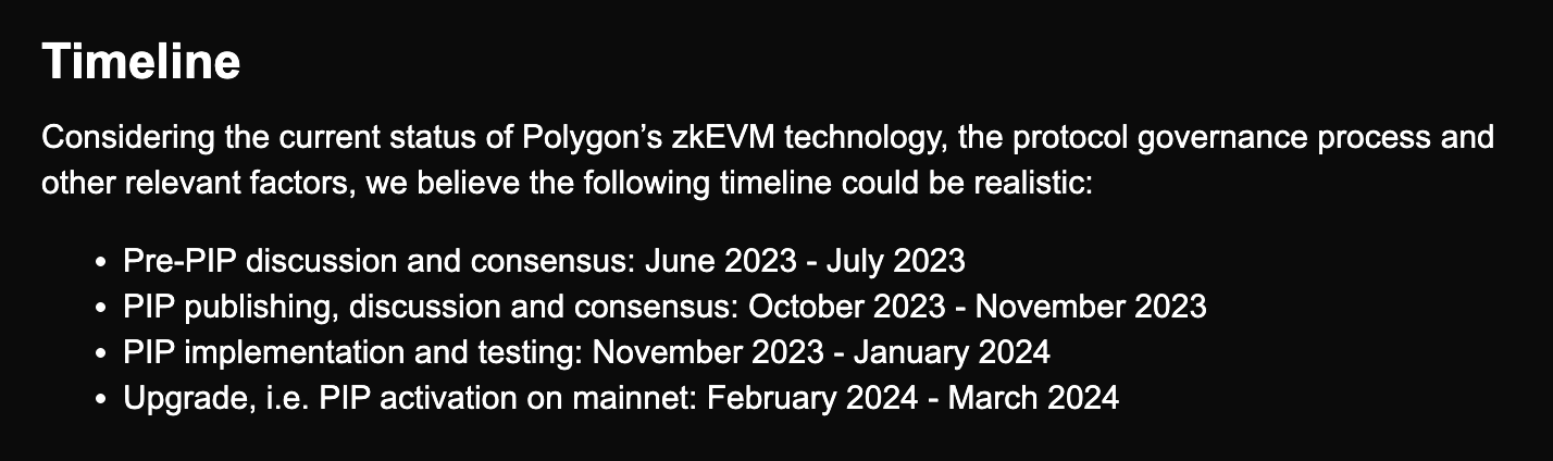 另据提案信息指出,目前将Polygon PoS升级为zkEVM Validium的提案处于讨论和汇集社群共识的阶段,实际的升级时间预计在2024年第一季度末上线,具体时间表如下所示: