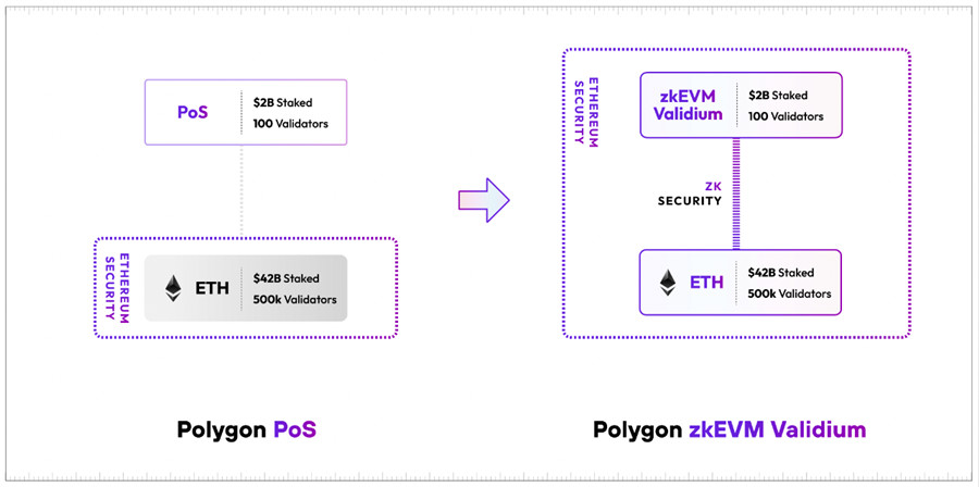 与此同时Polygon PoS作为目前业内相当成功且应用广泛的区块链之一,开发团队认为其实力和活跃度将有助于引导Polygon2.0愿景的进一步发展,因此决定了升级主链Polygon PoS的目标,使其能够兼容ZK技术并保持低成本、高扩展性的优势,且也获得更高级别的安全性。