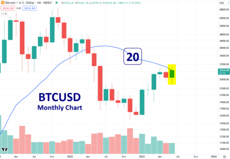 根据比特币/美元历史指数,比特币的 20 个月 SMA 目前位于 29,910 美元,略低于比特币当前略高于 30,000 美元的价格。这使得市值排名第一的加密货币自 2022 年 3 月以来首次略高于 20 个月移动平均线。潜在意义是什么?如果比特币能够在 6 月份结束时以月度蜡烛图收盘于 20 个月移动平均线上方,这将是比特币历史上第五次发生这种情况,并且是一个通常会导致价格上涨的信号。