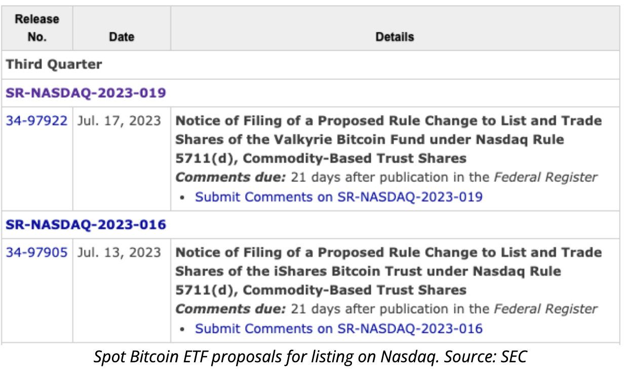 美国证券交易委员会(SEC)已经接受了Valkyrie的比特币交易所交易基金(ETF)提案进行正式审查。根据美国证券交易委员会纳斯达克规则制定清单的数据,Valkyrie关于其现货比特币ETF的提案于7月17日正式提交。