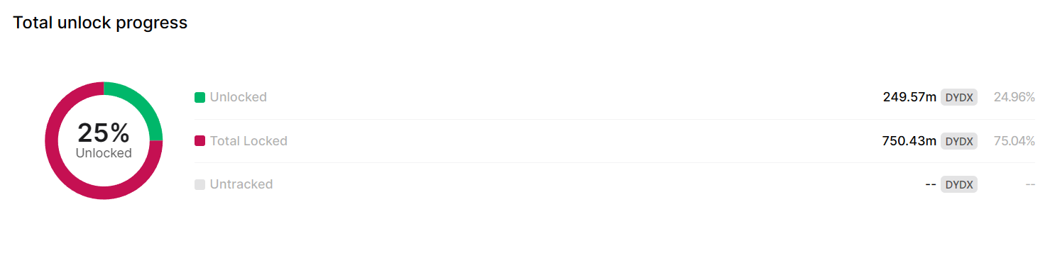 DYDX 的最大供应量为 10 亿枚代币,超过 75% 的代币被锁定,如上图所示。