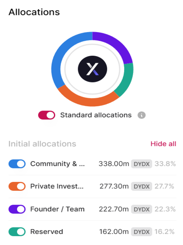 DYdX 在 8 月 1 日以相同的资金分配进行了相同的解锁活动。TokenUnlocks 的 dYdX 全部分配数据显示,投资者持有最高分配比例,为 27.7%,其次是交易奖励和社区金库,分别为 20.2% 和 16.2%。