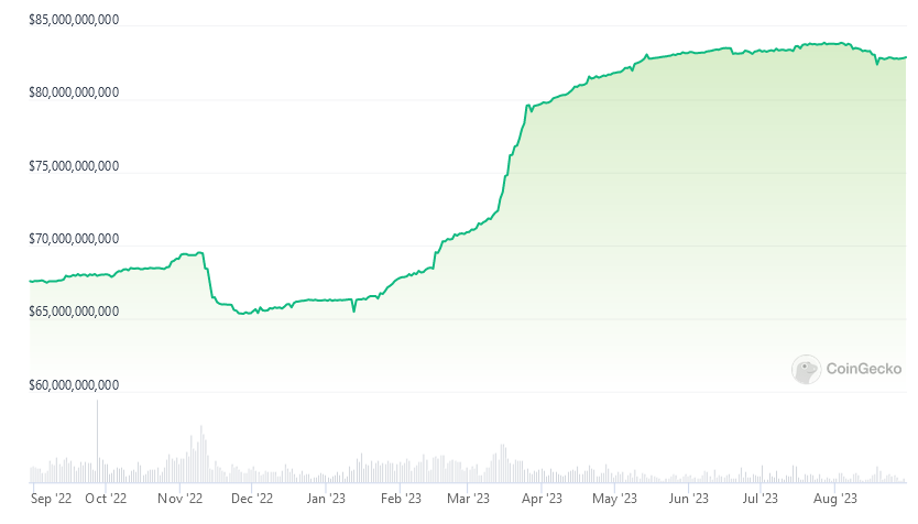 根据CoinGecko的数据,Tether 的 USDT 目前在稳定币市场占据主导地位,其市值为 829 亿美元,占总市场的 66.5% 。